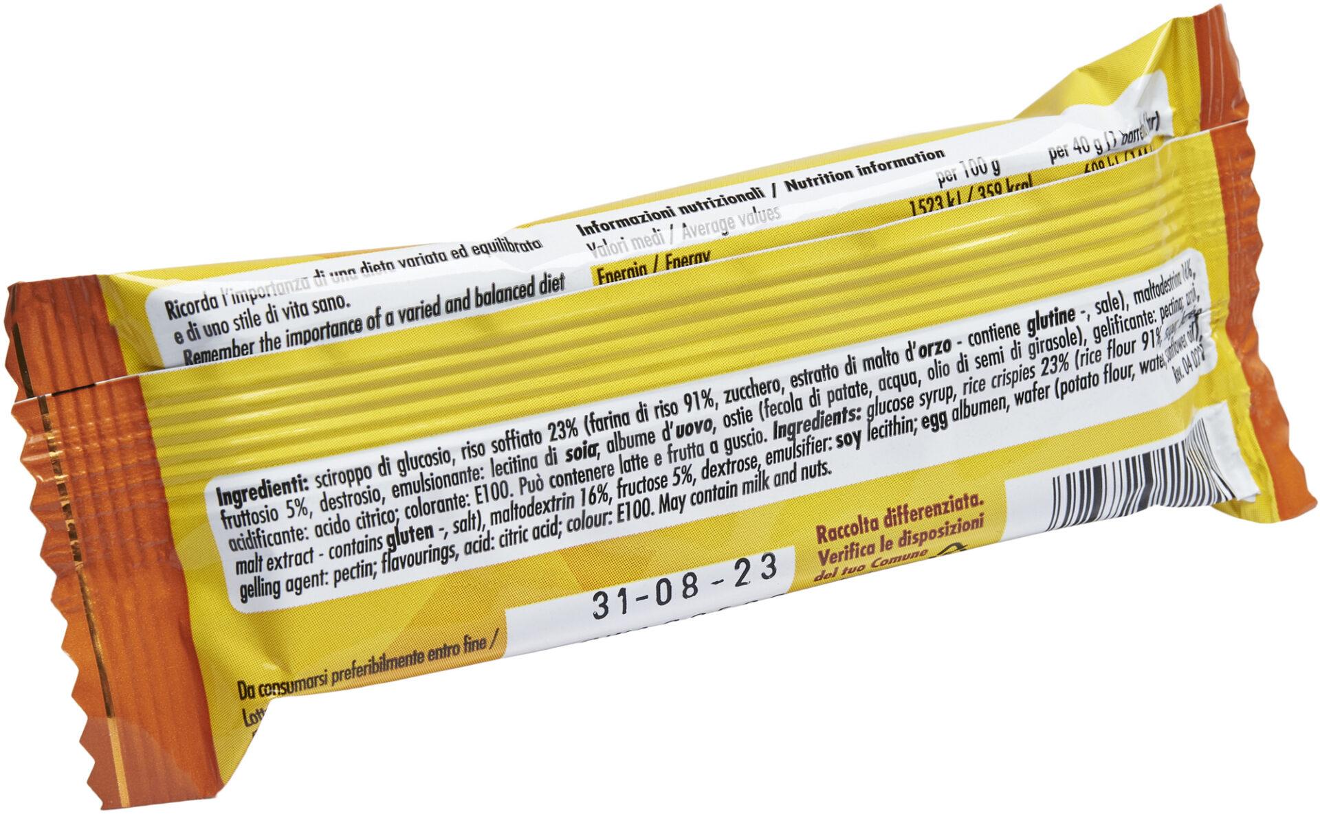 – Sal 0,3 gIngredientes:xarope de glicose, flocos de arroz 23% (farinha de arroz 91%, açúcar, extrato de malte de cevada – contém glúten –, sal), maltodextrina 16%, frutose 5%, dextrose, emulsionante: lecitina de soja; clara de ovo, bolacha (farinha de batata, água, óleo de girassol), gelificante: pectina; aromatizantes, acidulante: ácido cítrico; corante: E100. Pode conter leite e frutos secos.Tamanho: barra de 40 gSabor: Citrino