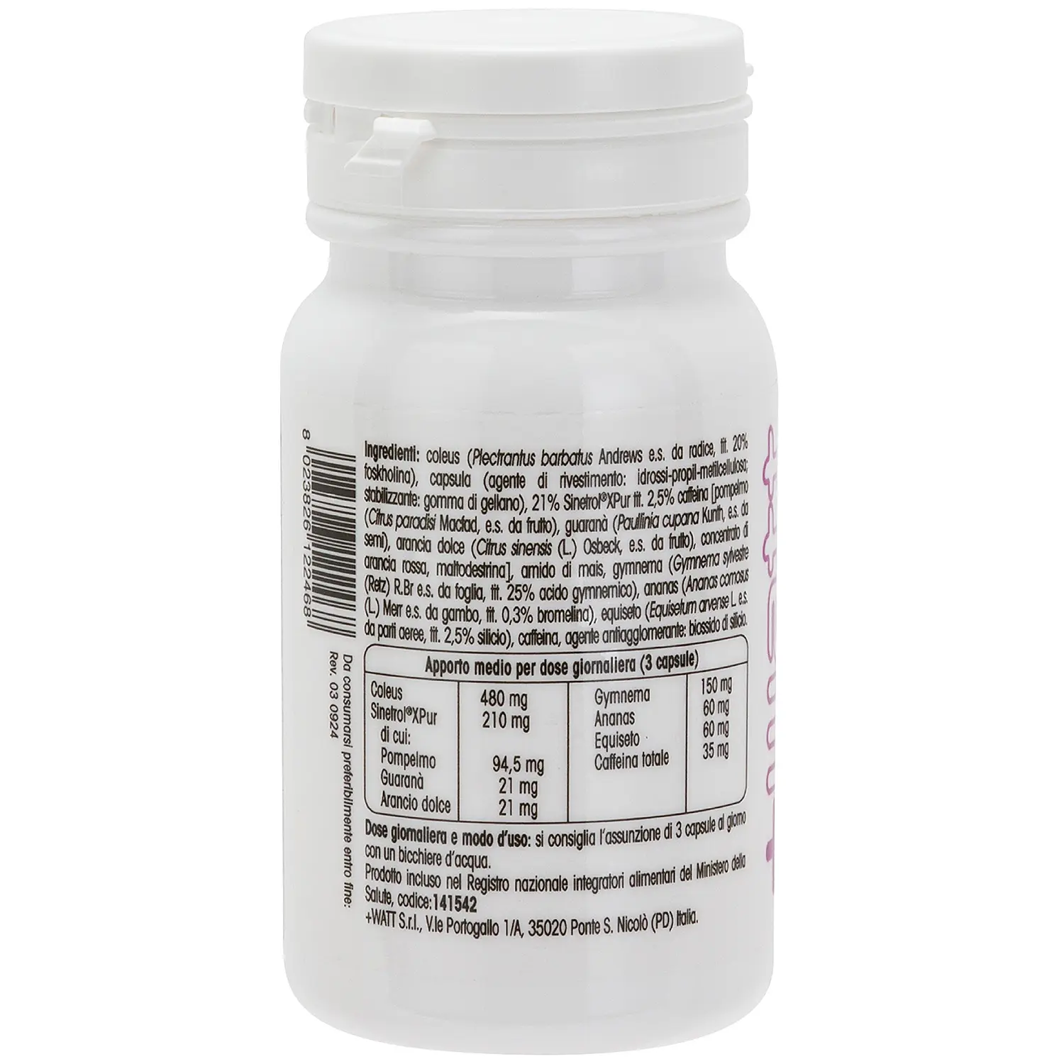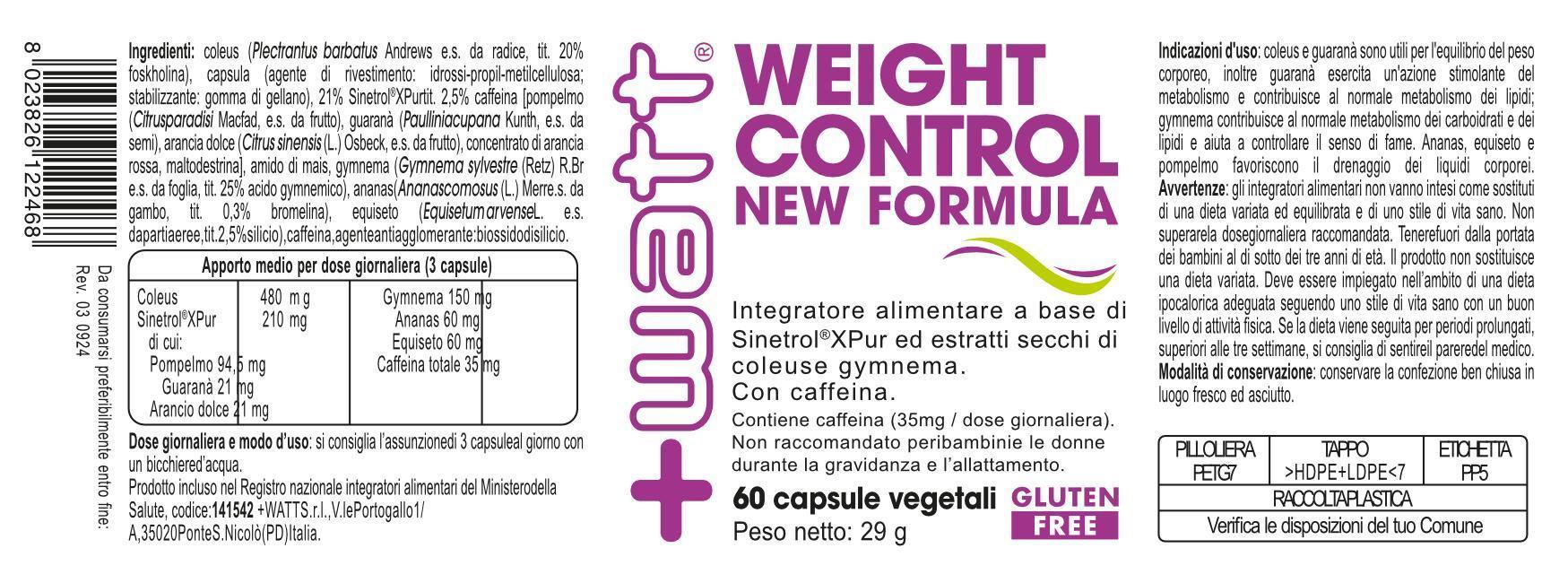 - A fórmula do Weight Control New Formula da +Watt combina vários extratos vegetais padronizados, com as seguintes propriedades:Coleus forskohlii: Contém forskolina, que estimula a produção de monofosfato de adenosina cíclico (cAMP), um segundo mensageiro que atua na lipólise (quebra de gorduras). Contribui para o equilíbrio do peso corporal. Sinetrol®XPur: Uma mistura patenteada de extratos de toranja (Citrus paradisi), laranja doce (Citrus sinensis) e guaraná (Paullinia cupana). Contém polifenóis que estimulam a libertação de ácidos gordos do tecido adiposo, utilizando a tecnologia Fat Shredding Technology™. Gymnema sylvestre: Apoia o metabolismo de hidratos de carbono e gorduras e ajuda a controlar a sensação de fome, reduzindo o desejo por doces.Ananás (Ananas comosus): O extrato do caule (tít. em bromelina) suporta a função digestiva e ajuda a combater a retenção de líquidos. Equiseto (Equisetum arvense): Favorece a drenagem de líquidos em excesso. A dose diária recomendada é de 3 cápsulas, ingeridas com um copo de água, e contém uma quantidade moderada de cafeína (35 mg por dose total, proveniente do guaraná).